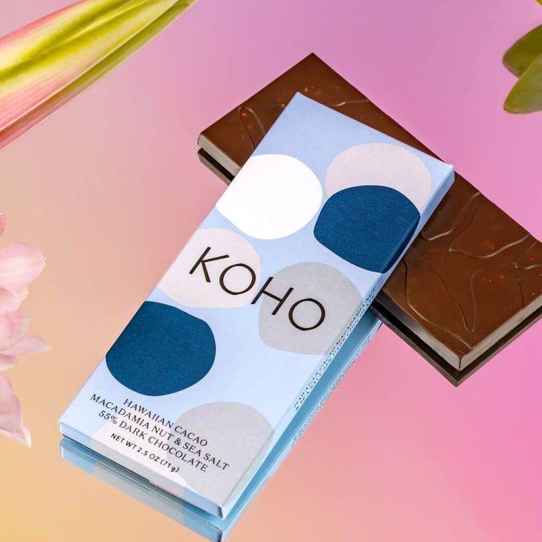 A salty-sweet treat that will have you imagining the rustling leaves of the macadamia tree caught in an island breeze. Made with Hawai'i-grown macadamia nuts and 55% Hawaiian cacao, our Macadamia & Sea Salt Dark Chocolate Bar is a must-try. Tastefully presented in our signature KOHO 2.5oz packaging.