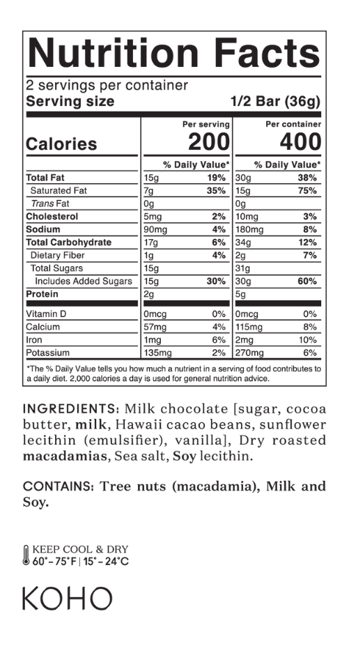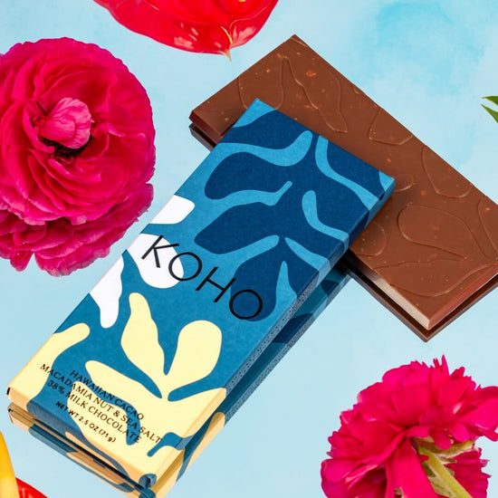 Local macadamias' buttery-crunch nicely makes its way into our Hawaiian Macadamia Nut Sea Salt Milk Chocolate. Hints of sea salt enhances the rich and creamy flavors of 38% Hawaiian Cacao and Hawaiian Macadamia. Tastefully presented in our signature KOHO 2.5oz packaging.