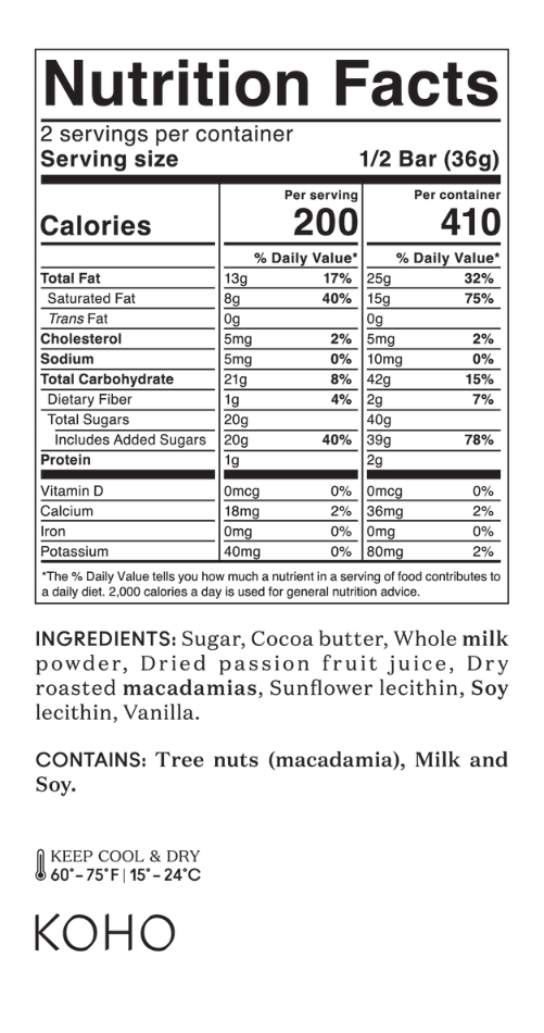 Allergen Statement: Products contain or are processed on same equipment in contact with Milk, Soy, and Macadamia Nuts.